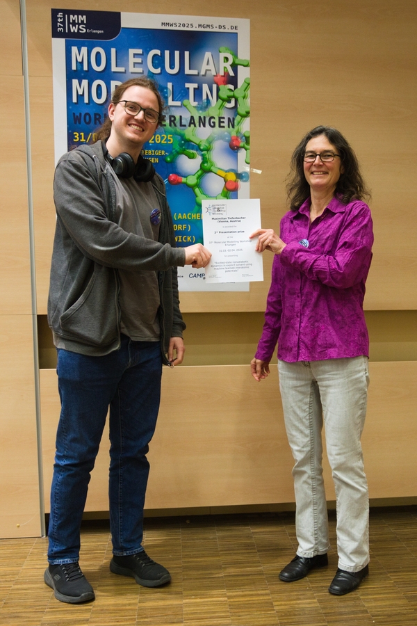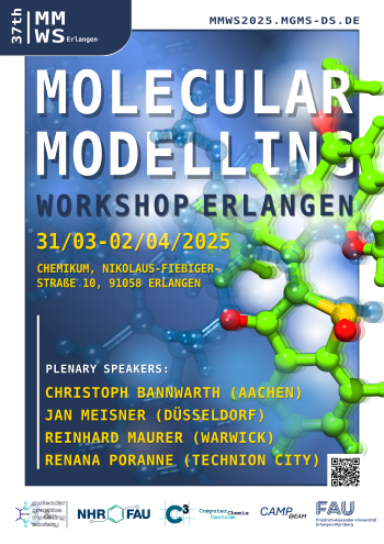The 37th Molecular Modeling Workshop 2025 is scheduled to take place in Erlangen from March 31st to April 2nd 2025 and offers an ideal platform for researchers, postdocs, and PhD students to showcase their findings to the molecular modeling community. This event enables young scientists to connect with peers from academia and industry, discuss their research, and receive valuable input from experienced researchers. Presentations of early-stage and ongoing research projects are highly encouraged.